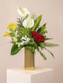 Our shiny gold box filled with red roses, white anthuriums, yellow callas, dendrobium orchids and stylish greenery. Simple and beautiful.