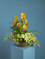 Orange callas, white dendrobium orchids and stylish greenery arranged in a glass vase filled with brown pebbles.