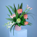 Our new guiding star vase, filled with light pink roses, white dendrobium orchids, pink anthuriums, a white brassica, pink callas and stylish greenery. Including a message saying: "Our guiding star, forever shining in our hearts".