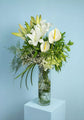 Long cylinder glass vase filled with white oriental lilies, anthuriums, dendrobium orchids and lush greenery. This arrangement is a timeless beauty.