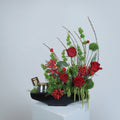 A dynamic arrangement featuring a black pot of red roses, sculptural greens, and reaching branches, paired with a milk chocolate bar and a jar of chocolate dragee. Composed to create the perfect gift.
