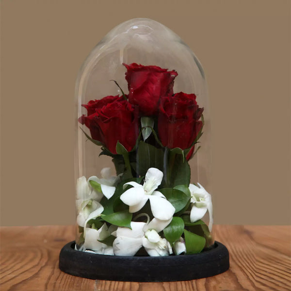 Red roses and white baby orchids arranged in a glass dome. A very romantic gift. Colors could be exchanged according to your preference. Artwork may look slightly different from original pictures. Please note that it might be necessary to substitute flowers depending on availability and seasonality. Goodies such as chocolates and cookies as well as balloons could be added to any arrangement.