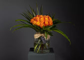 A glass vase filled with bright orange roses and greenery to complement. Colors could be exchanged according to your preference. Artwork may look slightly different from original pictures. Please note that it might be necessary to substitute flowers depending on availability and seasonality. Goodies such as chocolates and cookies as well as balloons could be added to any arrangement.