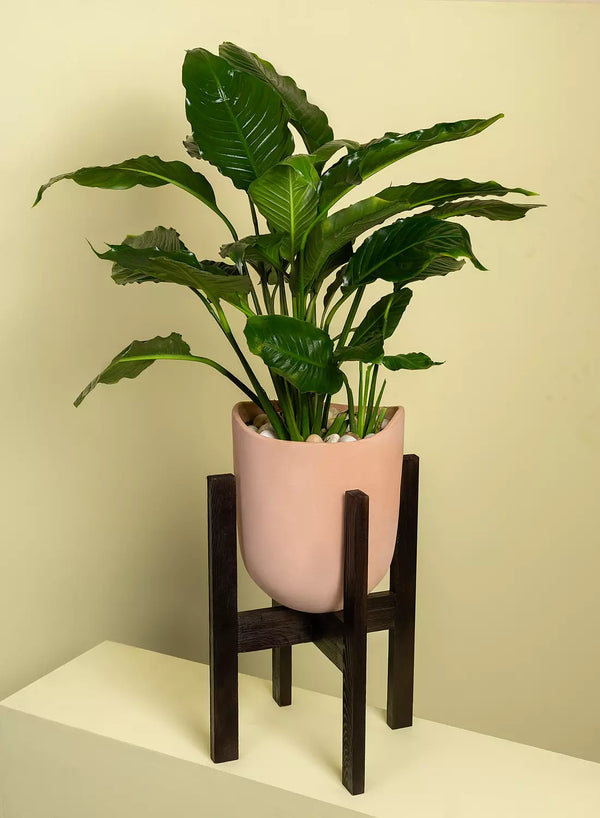 A beautiful peace lily planted in a pot with a brown wooden