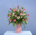 Blush tones and lush greenery come together in this enchanting arrangement, perfect for celebrating love and beauty, presented in a pink pastel flower pot.