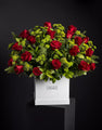 Our white box filled with beautiful red roses, green peas and greenery. Artwork may look slightly different from original pictures. Please note that it might be necessary to substitute flowers depending on availability and seasonality. Goodies such as chocolates and cookies as well as balloons could be added to any arrangement.