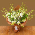Hand bouquet of white dendrobium orchids with a variety of greeneries. Artwork may look slightly different from original pictures. Please note that it might be necessary to substitute flowers depending on availability and seasonality. Goodies such as chocolates and cookies as well as balloons could be added to any arrangement.