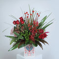 Sacred Heart is a beautiful box of flowers filled with very lush greenery and deep red roses popping out. The red mokara orchids and specially dyed red craspedia add to the drama. This flower arrangement is part of our new collection "TRIPPING OVER LOVE".