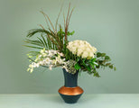 Minimalist yet dramatic, this artful composition of roses, orchids, and natural foliage in a sculptural pot exudes timeless beauty and contemporary charm.