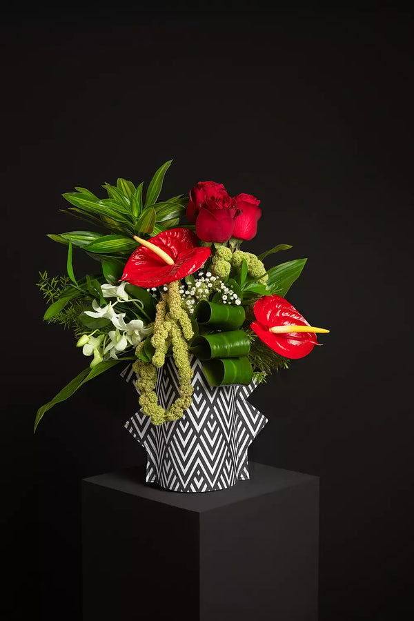 Florabel's new signature patterned Valentine's vase, filled with beautiful red roses, red anthuriums, white baby orchids, green celosias, baby's breath and a mix of greeneries.