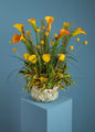 Glass vase with white pebbles filled with yellow roses, orange callas, craspedias and stylish greenery.