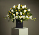 Our black box filled with white roses, white baby orchids and craspedias. Artwork may look slightly different from original pictures. Please note that it might be necessary to substitute flowers depending on availability and seasonality. Goodies such as chocolates and cookies as well as balloons could be added to any arrangement.