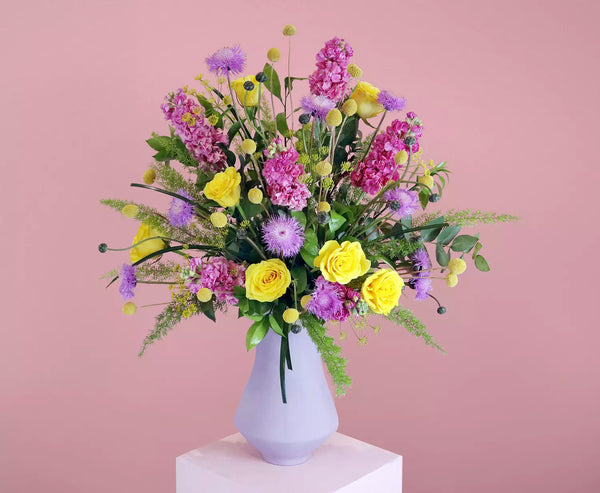 A symphony of color and texture, this floral arrangement captivates with striking yellow and purple blooms, elegantly arranged in a modern pastel pot.
